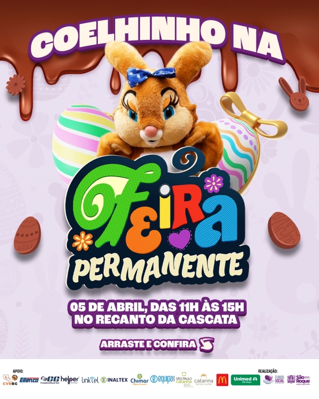 Além disso, no dia 5 de abril, os Coelhinhos da Páscoa também marcarão presença na Feira Permanente, das 11h às 15h, em um grande encontro que promete encerrar a programação com muita alegria e diversão.